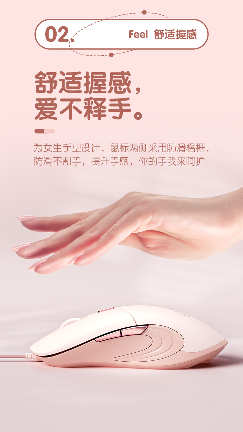 为女生手型设计,鼠标两侧采用特殊纹路防滑格栅,